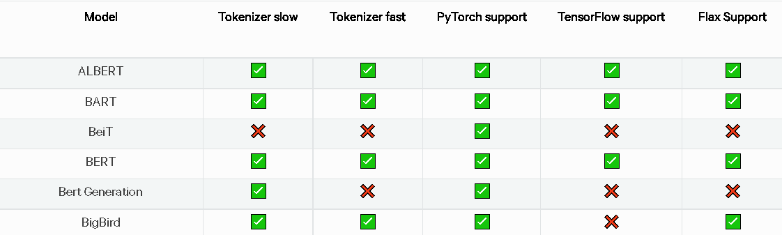- 是否有PyTorch support、TensorFlow support或Flax Support