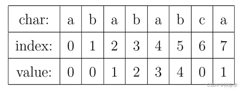 p[j]==p[i],j先后移,next[i]=j,然后i后移;- 如果不匹配,前缀指针回退,退到前一位置的