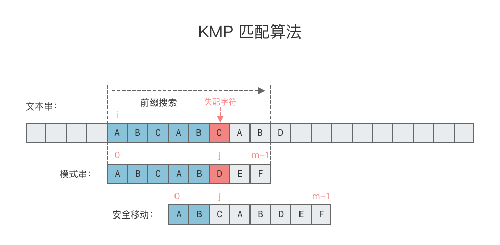 p的前j个字符中,前k位前缀和后k位后缀相同,("ABCAB"中有相同的前后缀"AB",即k=2)那么可以断言:文本串中i指针失配位置之前的k位(”AB“)一定与模式字符串的第0位至第k位是相同的(”AB“),即长度为k的后缀与前缀相同。这样一来,我们就可以将这些字符段的比较省略掉。具体的做法是,保持